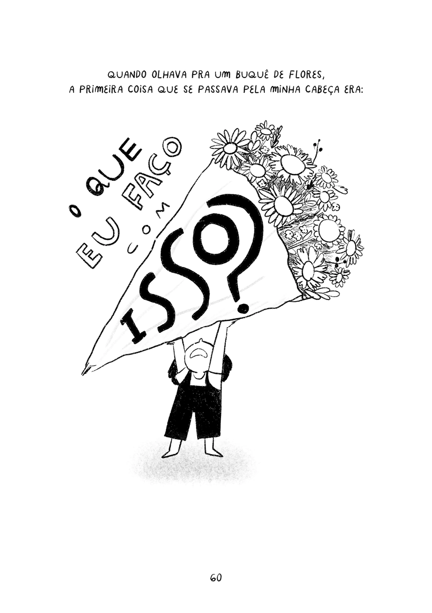 Por que flores são tão associadas ao amor romântico e são símbolos institucionalizados de feminilidade? Por que a gente tende a atribuir valor pras coisas só quando elas são úteis? O que é SER útil? O que isso tem a ver com o capitalismo, com a minha vó e com você? Descartes uma vez escreveu: "Para examinar a verdade é necessário, pelo menos uma vez na vida, por todas as coisas em dúvida, tanto quanto se puder". Nessa reflexão em quadrinhos não é o intuito responder todas as perguntas, mas sim criar novos questionamentos partindo do exercício de investigar algo que era tomado como dado - "por que eu passei minha vida toda dizendo que odiava flores? Por que odiaria algo muito mais efêmero e antigo que eu?"